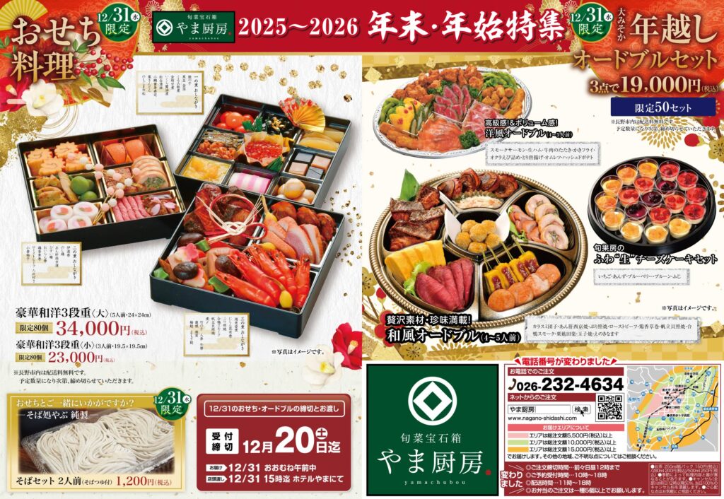 おせち料理・オードブルのご予約 受付中です 2025 11/22 2025年11月22日 初春の味わいを愉しむ喜びのおせち今年も新年を華やかに彩る【おせち料理】をご用意しました。 創業70年の老舗日本料理店やま茶屋が手作りに拘ったおせちをお楽しみ下さい。 受付締切は12月20日(土)です。ご予約をお待ちしております。 おせち料理のご予約はこちら ※詳しくは以下のチラシをご覧ください。 おせち料理のご予約はこちら 目次年末年始の休業について やま茶屋 12/27(土)〜 1/4(日)やま厨房 12/26(金)〜 1/4(日) よかったらシェアしてください! 「きのこと銘酒の会」 開催決定!!! 年末年始休業のお知らせ 関連記事 年末年始休業のお知らせ 2025年11月22日 「きのこと銘酒の会」 開催決定!!! 2025年9月19日 名物きのこ鍋 2025年9月19日